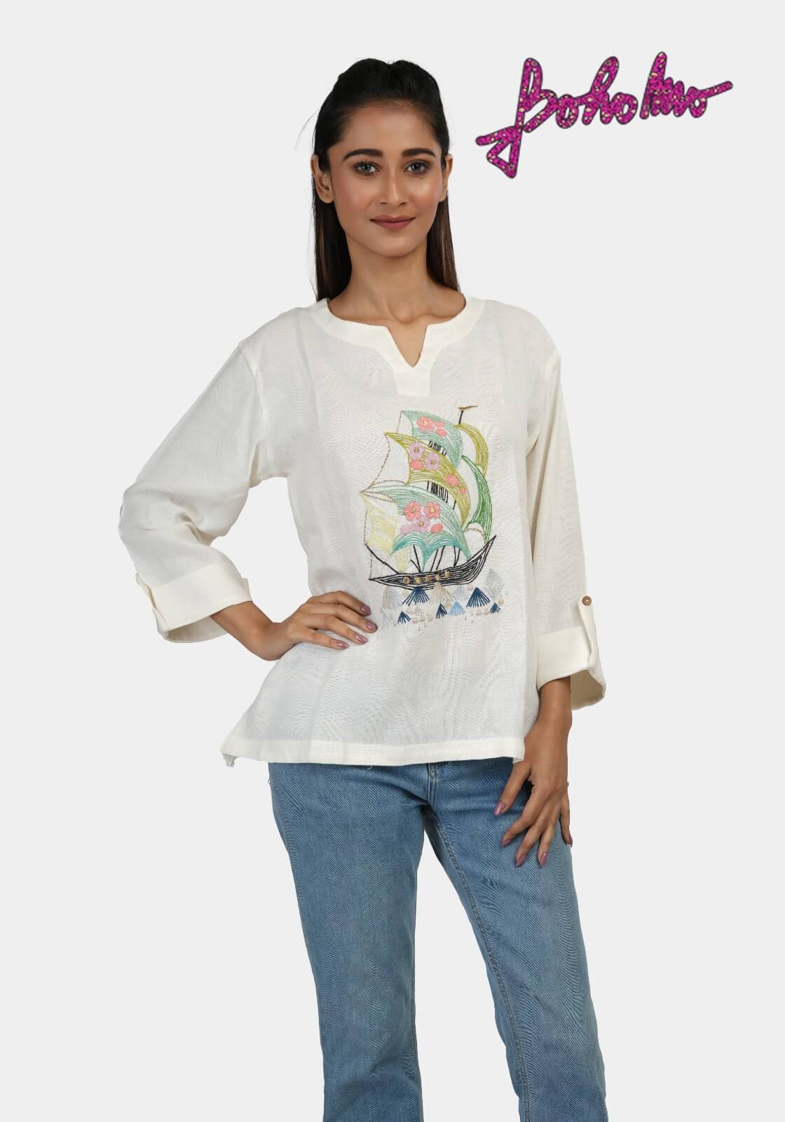 White Khadi Chinse Collar Cotton Top with sea horse embroidery on chest.