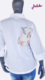 Multicoloured leaves in pastel shades embroidered on the front and top back half of a Khadi Cotton Shirt