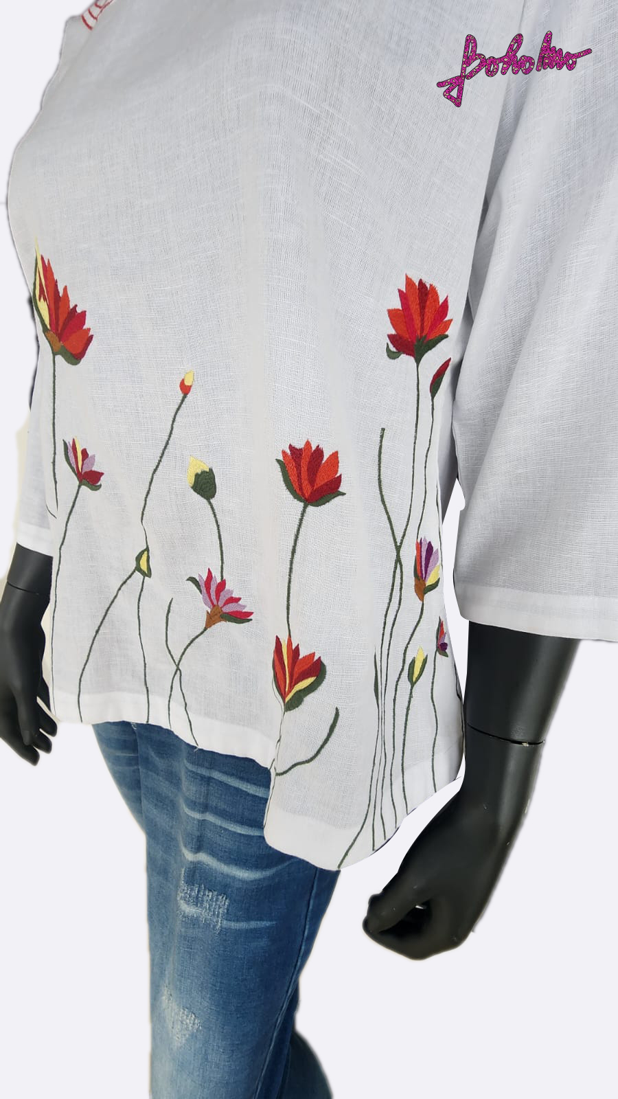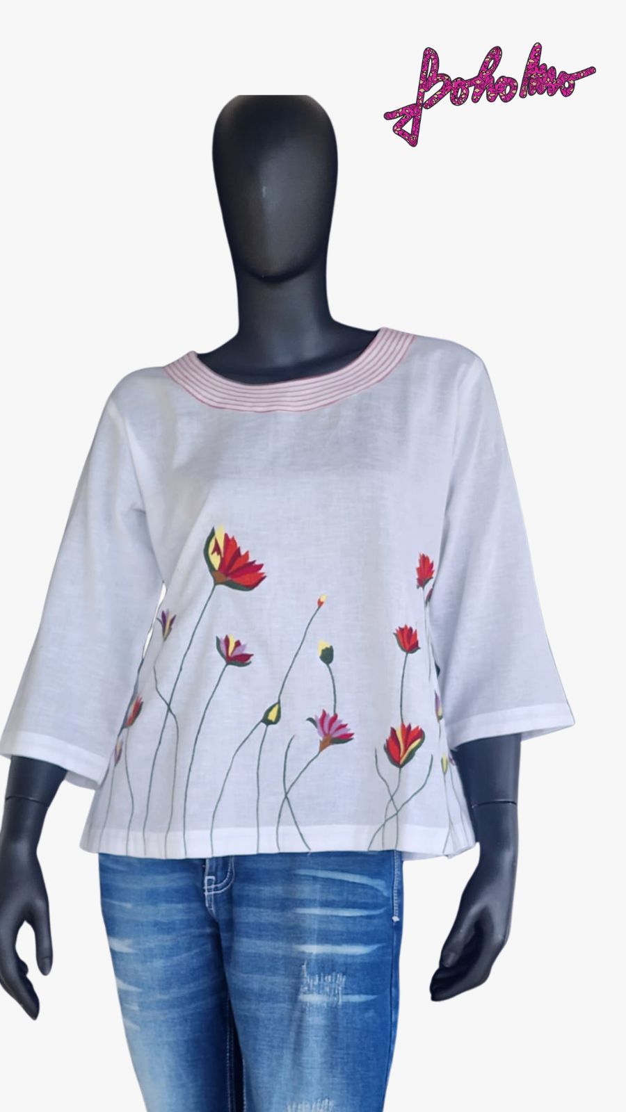 White Khadi Cotton Kurti Top with long stemmed lotus in multicolour all over and kantha stitch on neck line.
