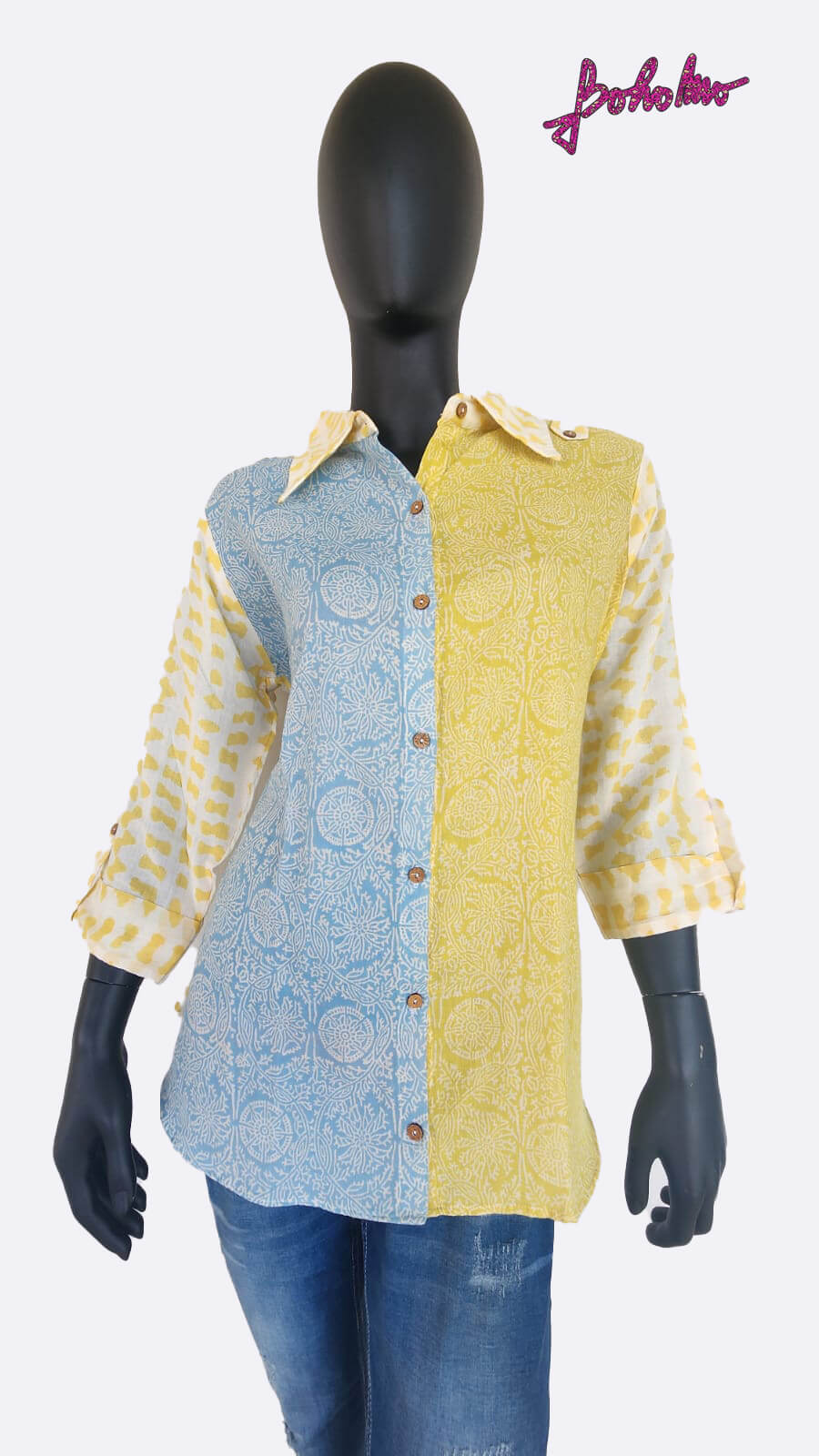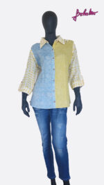 Mulmul shirt in mixed prints of yellow white and blue