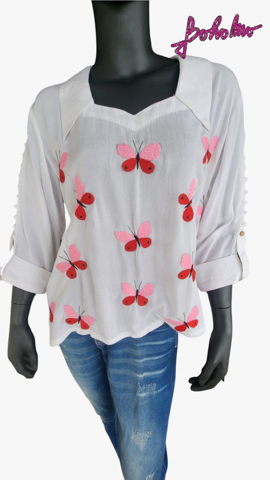 White Crimped Cotton short Kurti top with colourful butterflies all over in pink and red