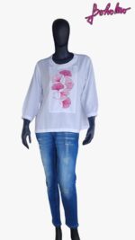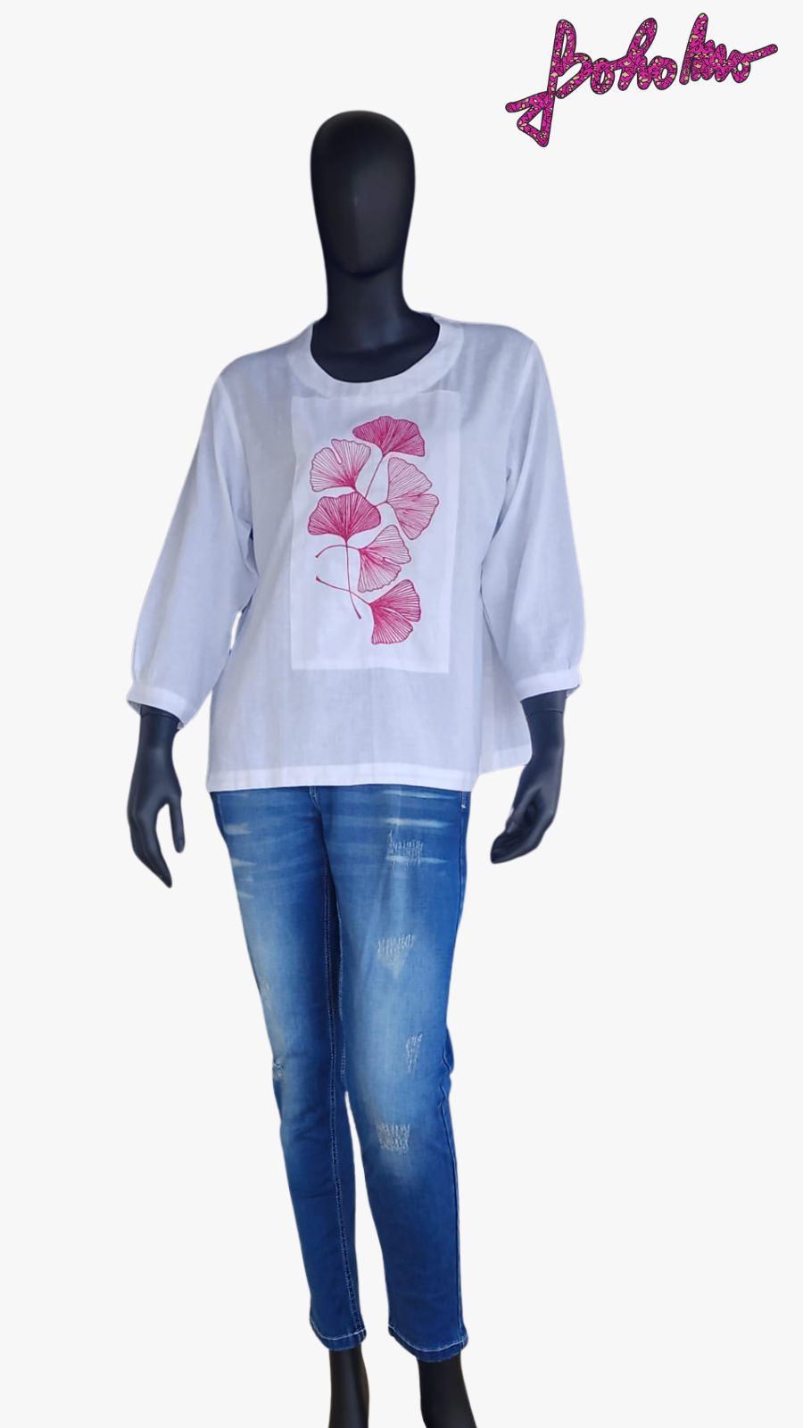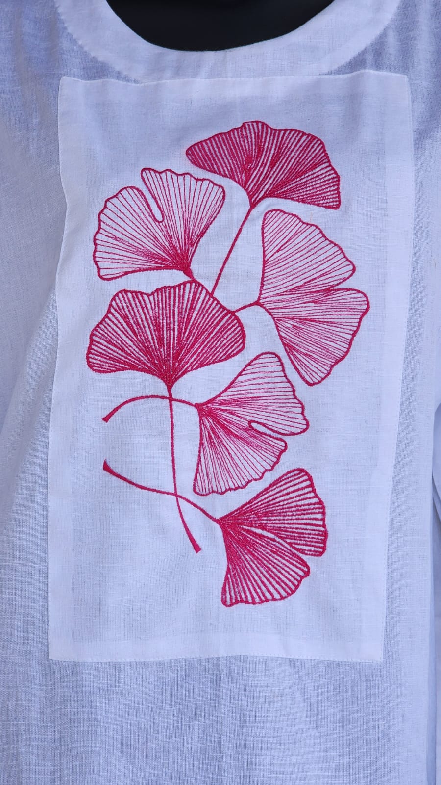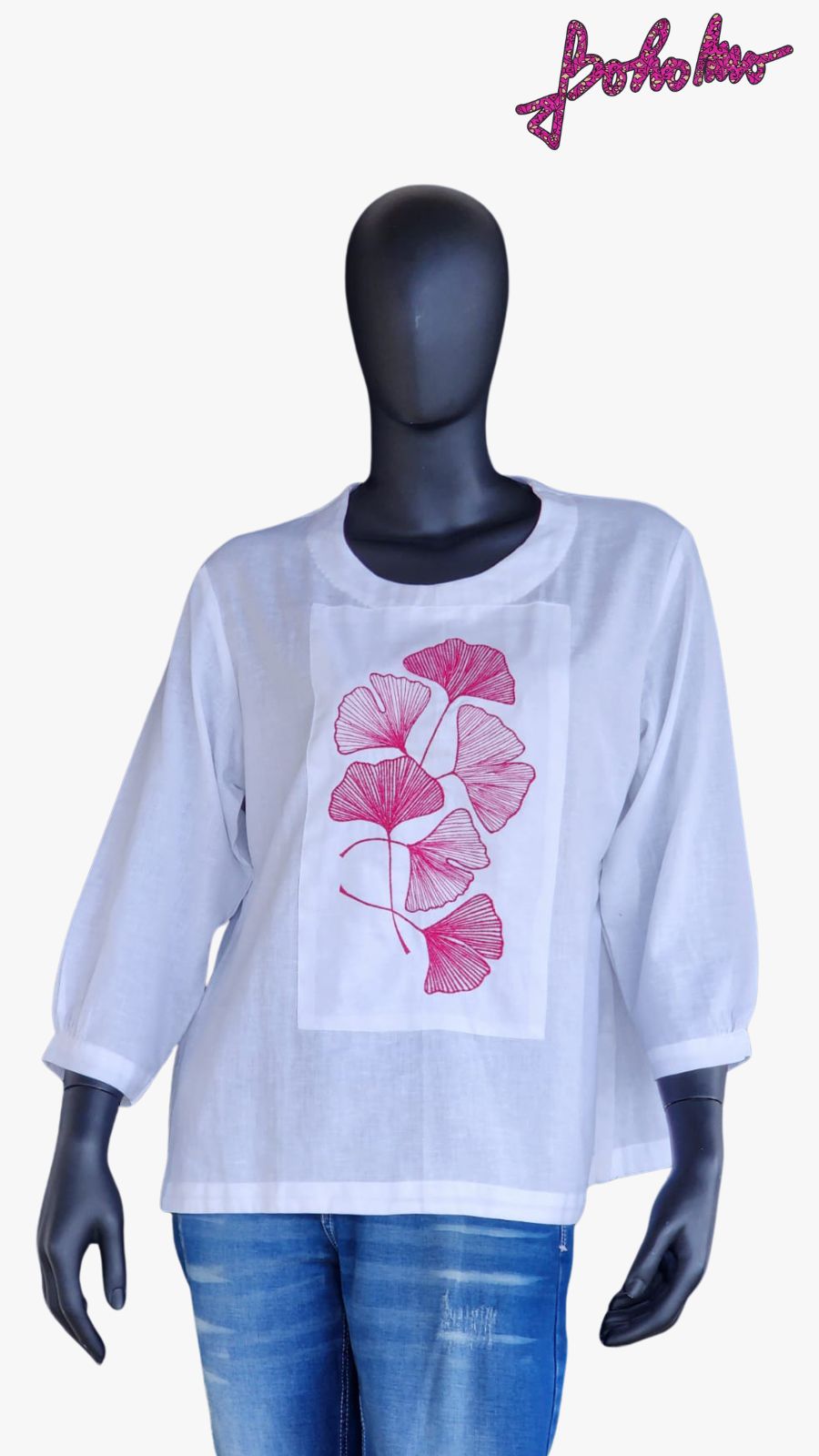 White Khadi Cotton short kurti top with fan shaped flowers in pink and magenta on the yoke