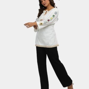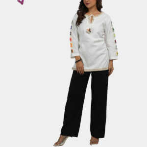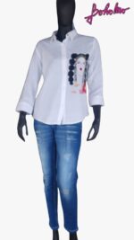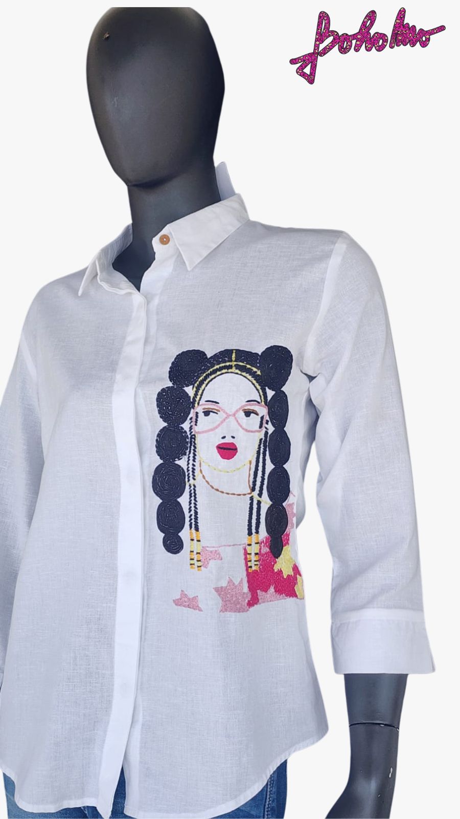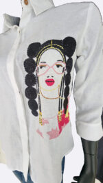 White Khadi Cotton Short with a very cute embroidery of a plaited girl with spectacles