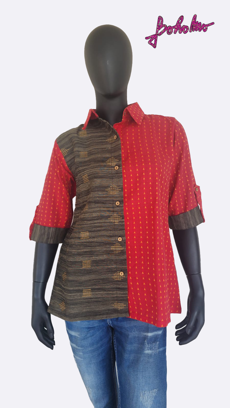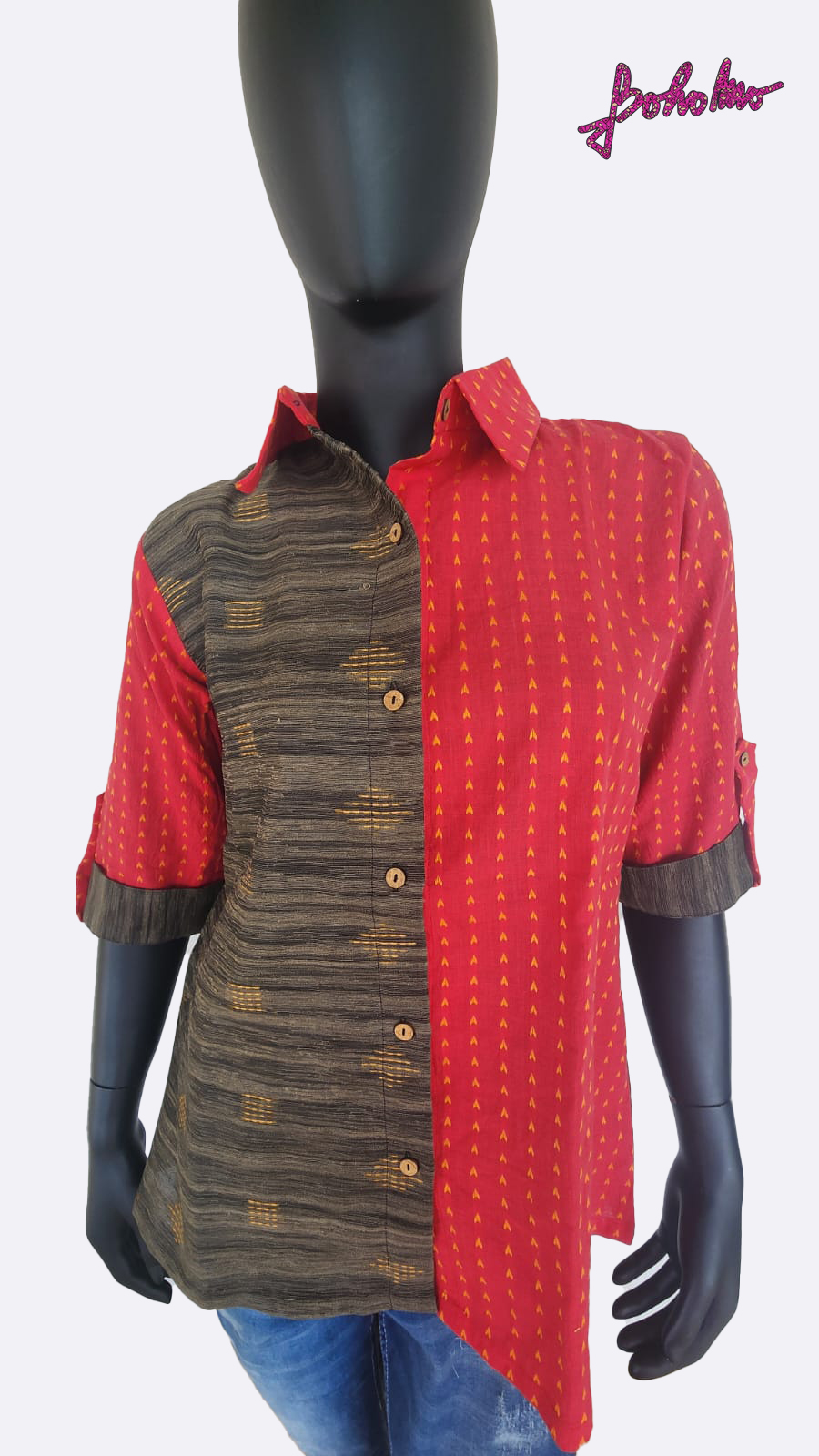 Red and Steel grey half and half top in steel grey silk cotton with mustard weave and south cotton in mustard Shirt