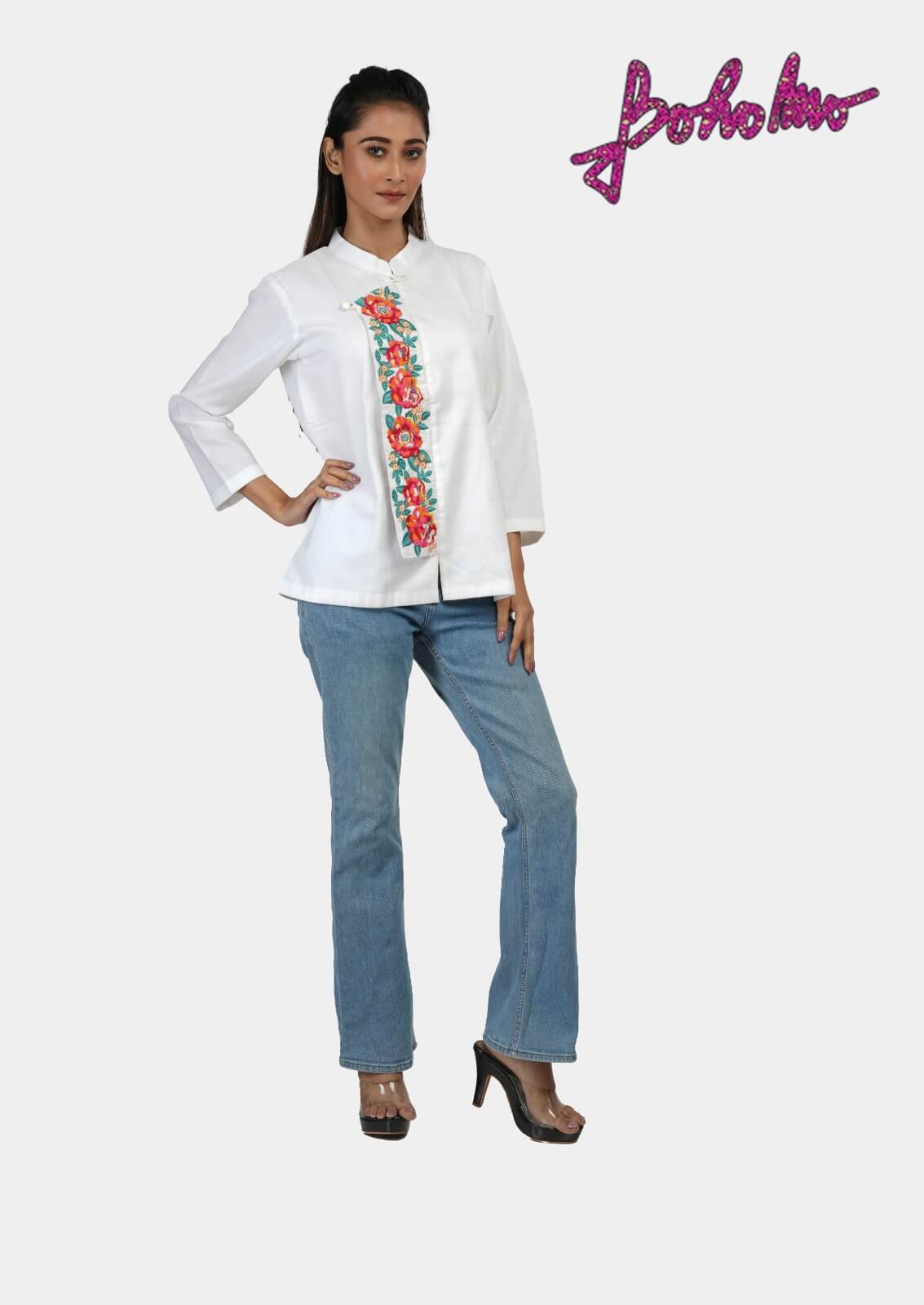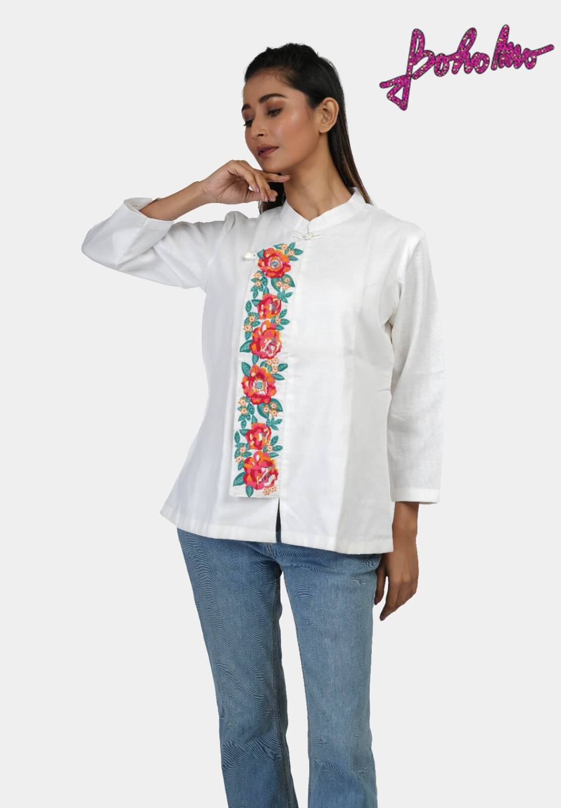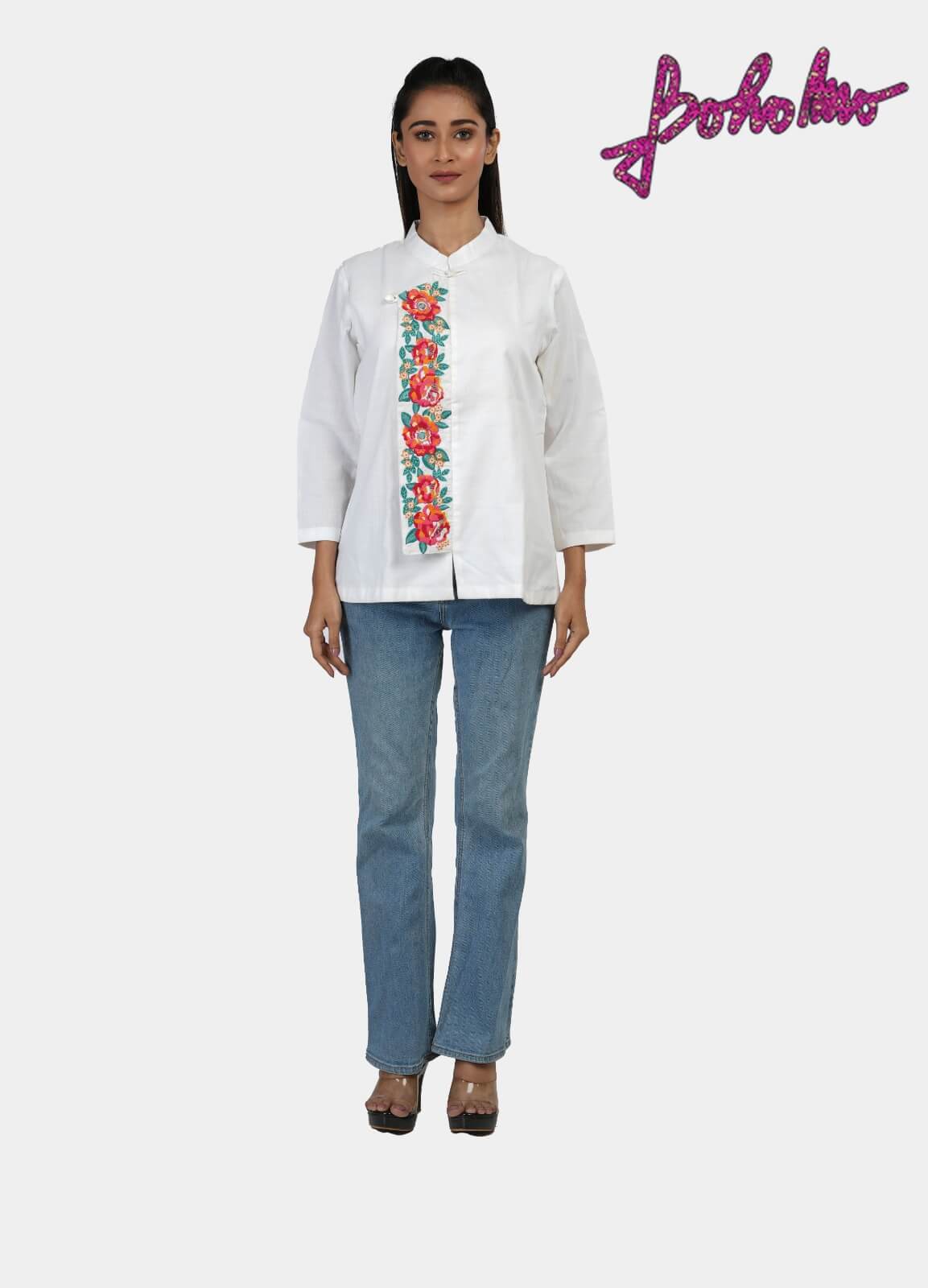 White Khadi Chinse Collar Cotton Top with sea horse embroidery on chest.