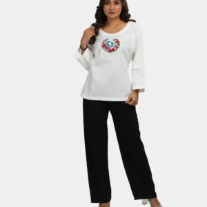 White Khadi Chinse Collar Cotton Top with sea horse embroidery on chest.