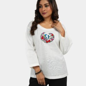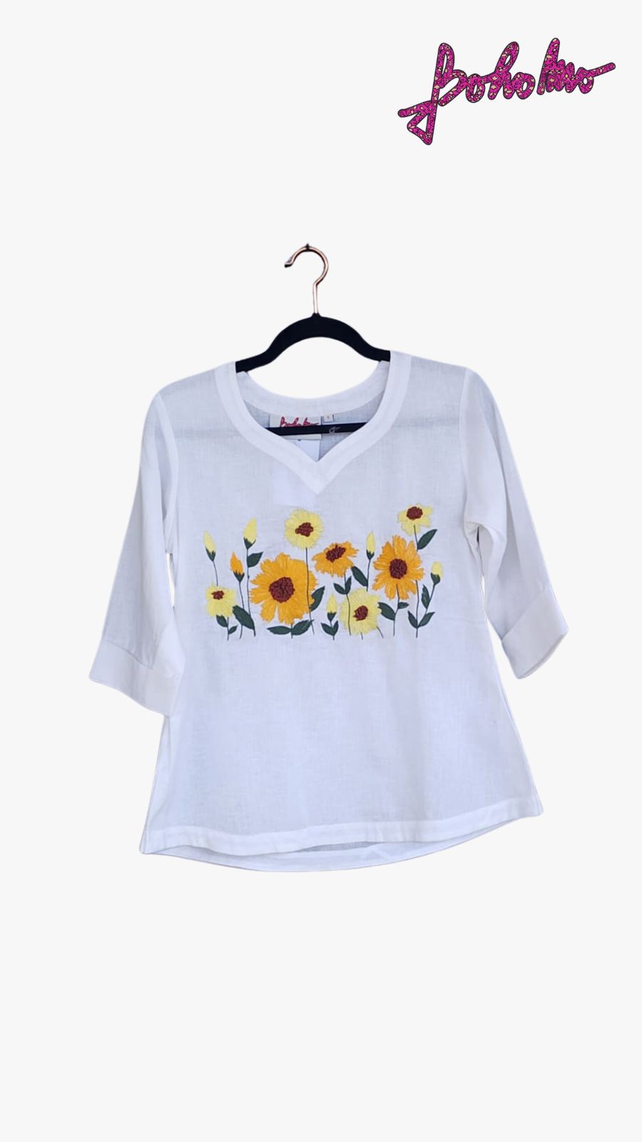 White Khadi kurti top with a row of orange sunflowers and leaves on chest