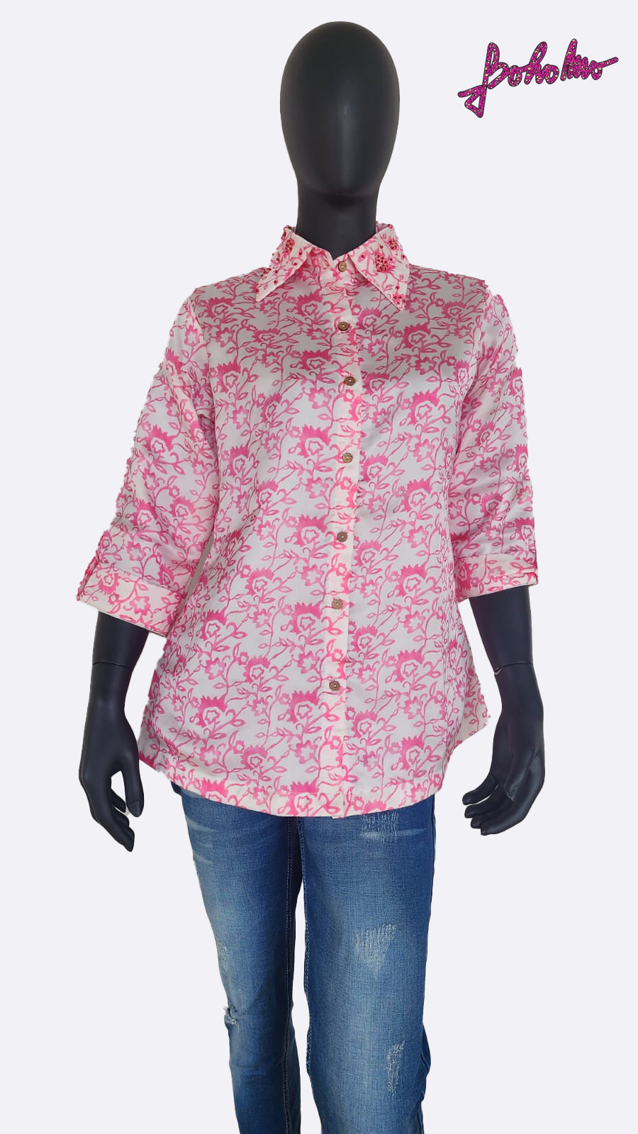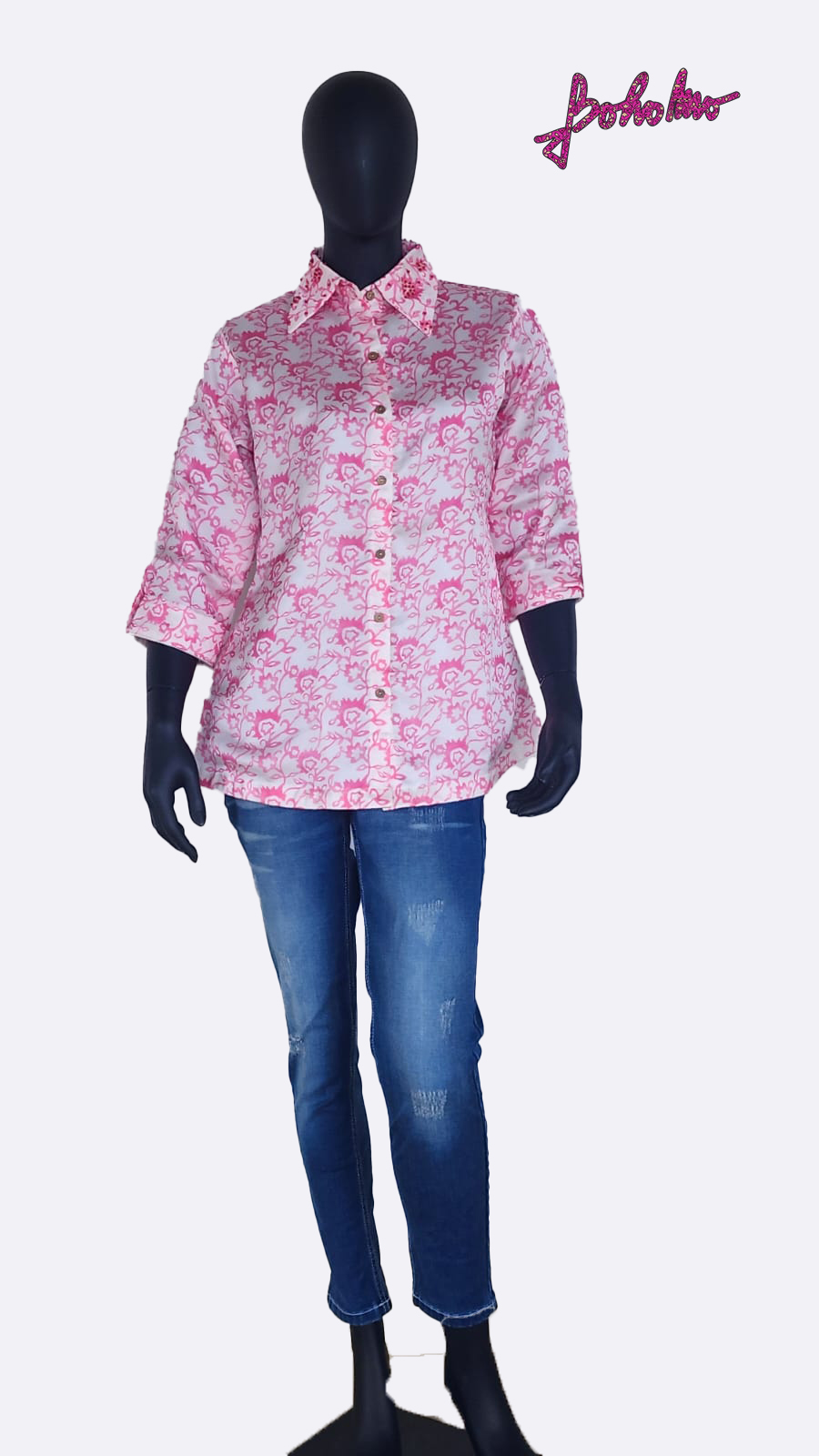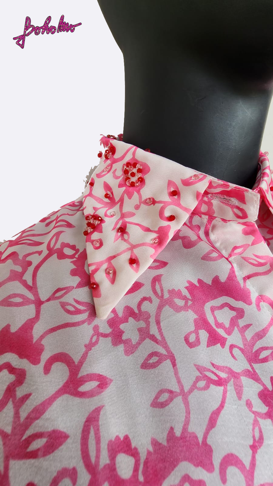 Pink and white printed georgette satin with beadwork on collar