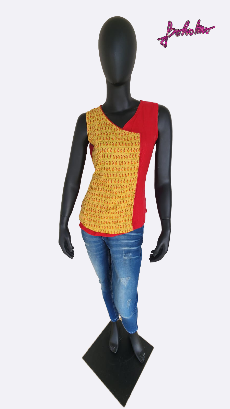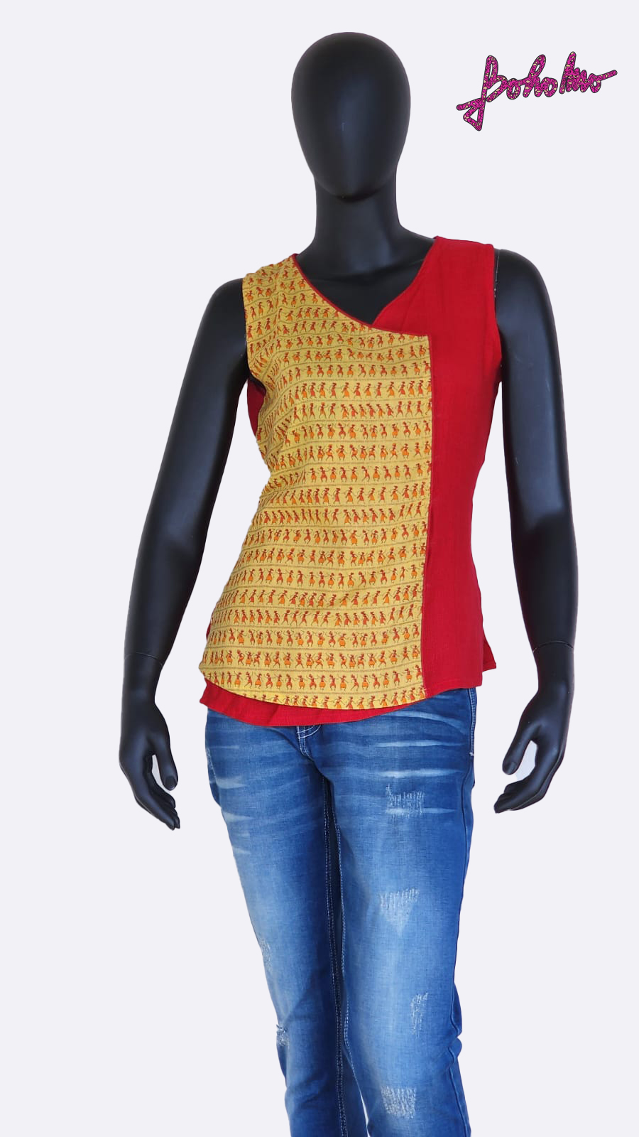 Red Linen Matty and yellow cotton printed half and half angrakha style half and half top